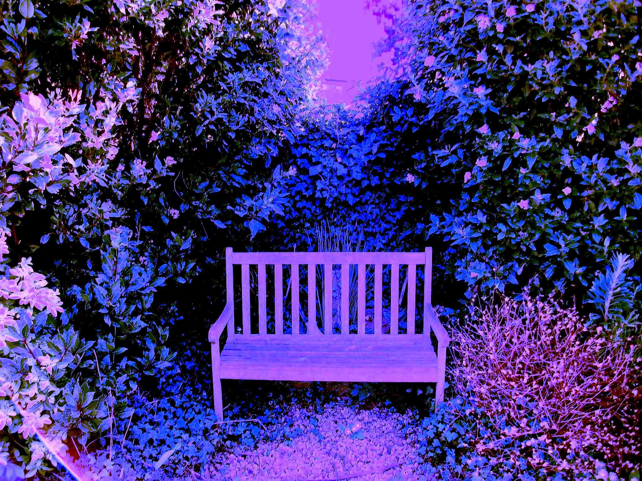 “This series of photographs by Katalina S’Bath forms a unified entity. The key artwork in the series is the one on which is a demonstratively empty garden bench in eternal lilac twilight – as the sign of lack of a human presence in this world. The soul is looking through colour glass of the heavenly stained-glass in the the garden of eternally flowering life where the branches of trees are heavy with never withering flowers of secret scents.“